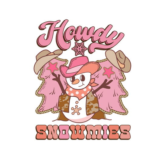 Un alegre muñeco de nieve con un sombrero de vaquero y un pañuelo rosa, rodeado de árboles rosados, te da la bienvenida con un "Howdy Snowmies".