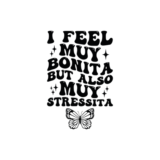 Un diseño divertido que presenta la frase "Me siento muy bonita pero también muy estresada" con una ilustración de mariposa.