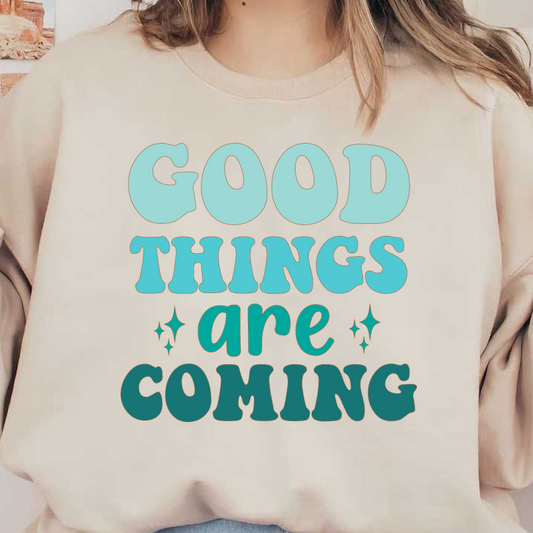 Un diseño gráfico alegre que presenta la frase inspiradora "Se avecinan cosas buenas" en letras coloridas y divertidas.