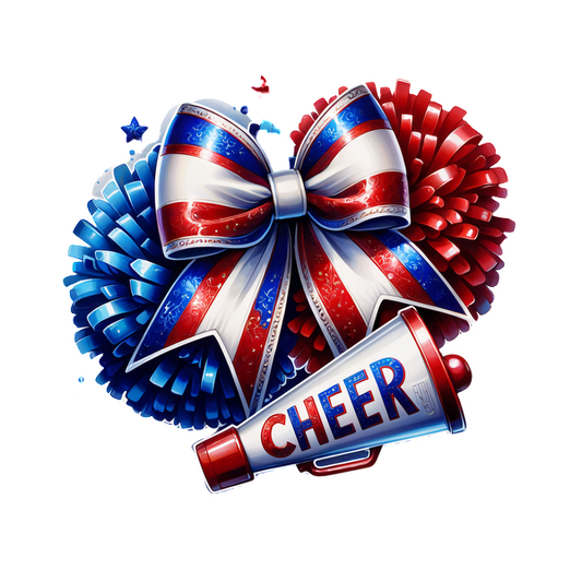 Diseño alegre con pompones rojos, blancos y azules, un lazo brillante y un megáfono con la palabra "CHEER" claramente visible. Transferencias DTF