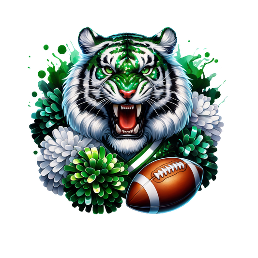 A fierce tiger head with vibrant green stripes roars amid colorful flowers and a football, showcasing a bold sports theme.DTF Transfers dtf transfers