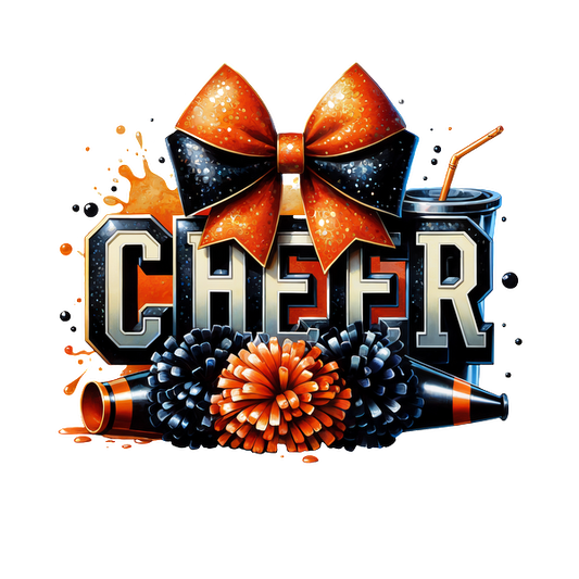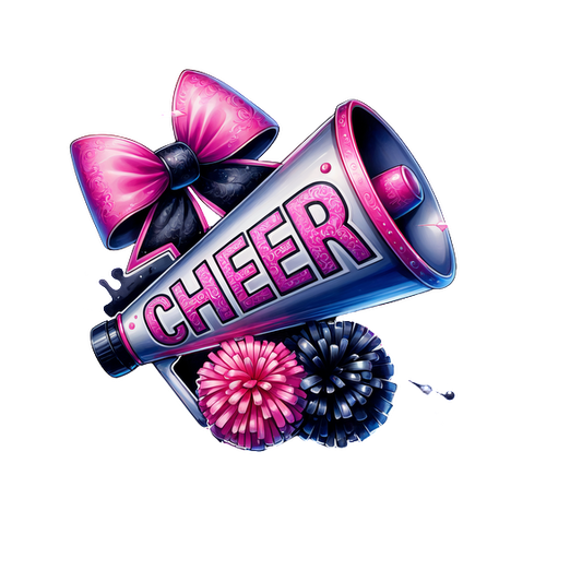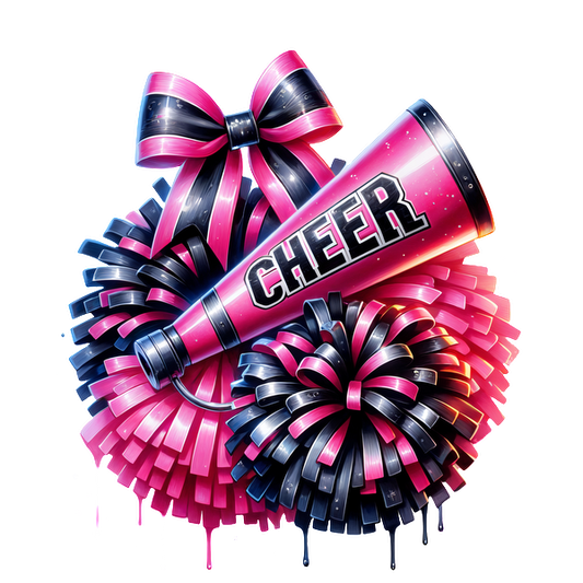 A vibrant cheerleading arrangement featuring pink and black pom-poms, a "CHEER" megaphone, and a stylish bow.DTF Transfers dtf prints