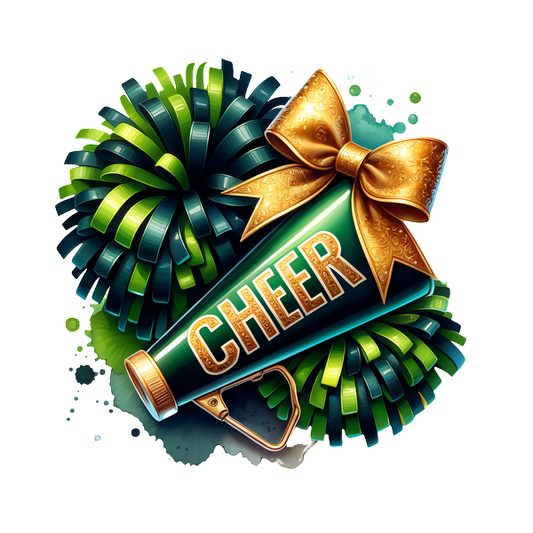 Un megáfono de animadora vibrante adornado con un lazo dorado, rodeado de pompones verdes vivos, ¡perfecto para celebrar eventos! Transferencias DTF