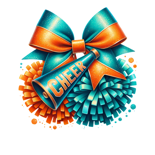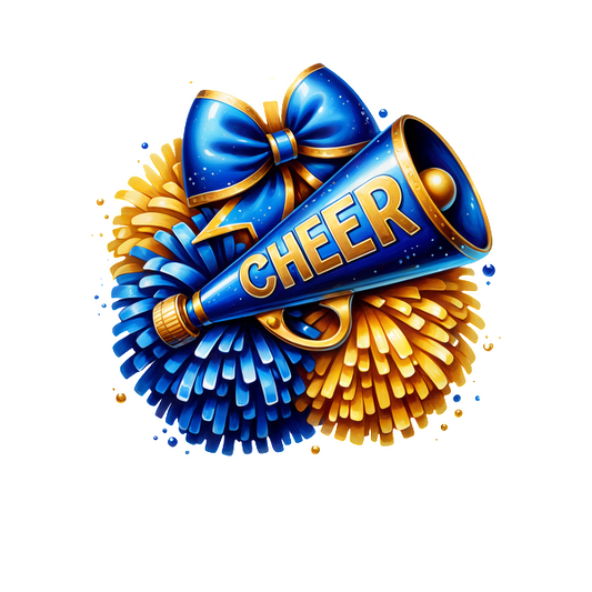 A vibrant cheerleading megaphone with a "CHEER" message, surrounded by blue and gold pom-poms and a decorative bow.DTF Transfers dtf transfers