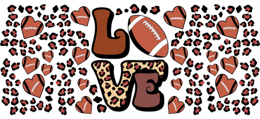 Un diseño divertido y lúdico que presenta la palabra "LOVE" con un tema de fútbol, rodeado de elementos festivos como balones de fútbol y manos de animadoras. Transferencias UV