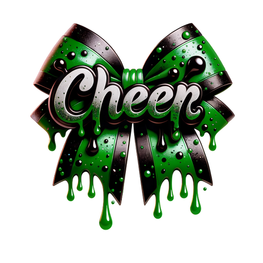 A vibrant green and black bow with a glossy finish, featuring the playful word "Cheer" in a stylish font.DTF Transfers dtf transfers