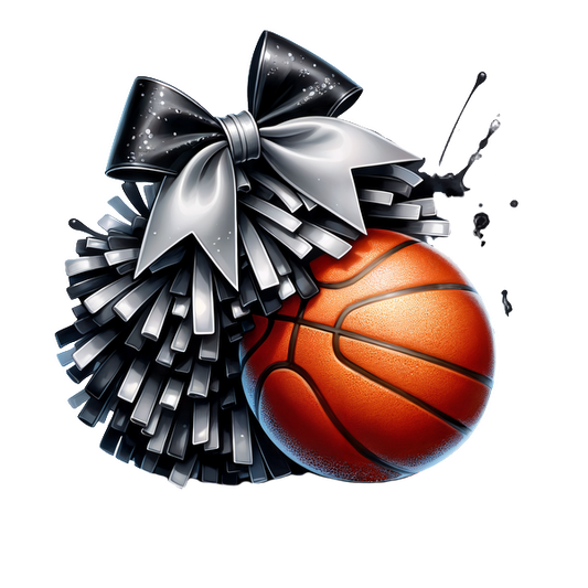Una ilustración vibrante que presenta una pelota de baloncesto adornada con un pompón y un lazo de animadora en negro y plata brillante, que muestra el espíritu de equipo. Transferencias DTF