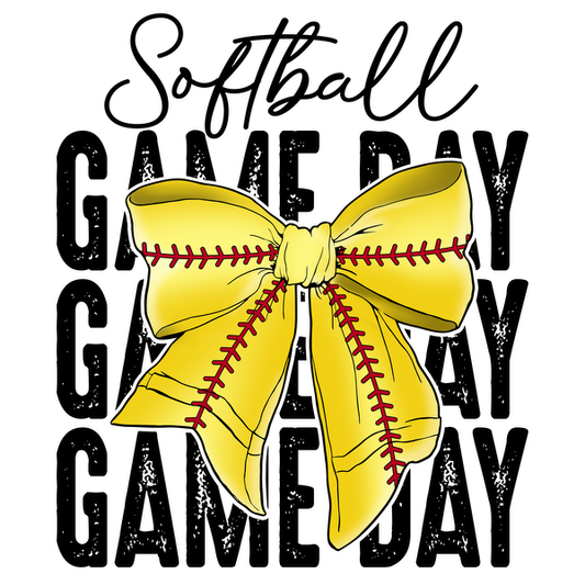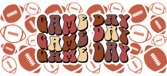 Gráfico atrevido y colorido que presenta la frase "Game Day" repetida, rodeada de divertidas ilustraciones de fútbol para una atmósfera deportiva animada. Transferencias UV