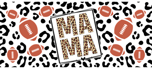 Un diseño divertido que presenta la palabra "MAMA" en un estampado de leopardo, rodeada de vibrantes ilustraciones de fútbol. Transferencias UV
