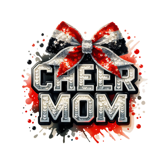 Gráfico festivo y brillante "Cheer Mom" con un lazo brillante y letras llamativas, ¡perfecto para las orgullosas mamás animadoras! Transferencias DTF