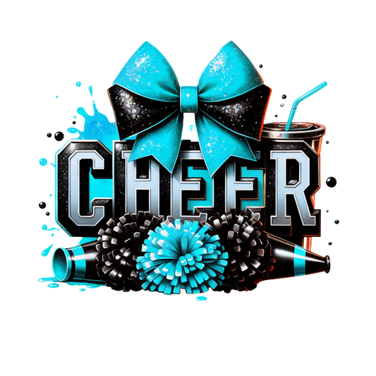 A vibrant graphic celebrating cheerleading, featuring bold "CHEER" text, pom-poms, a blue bow, and colorful party elements.DTF Transfers dtf transfers