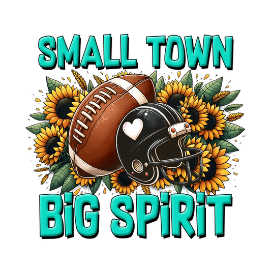¡Celebre el orgullo de pueblo pequeño con este diseño vibrante que presenta un balón de fútbol y un casco rodeados de alegres girasoles y un texto animado!
