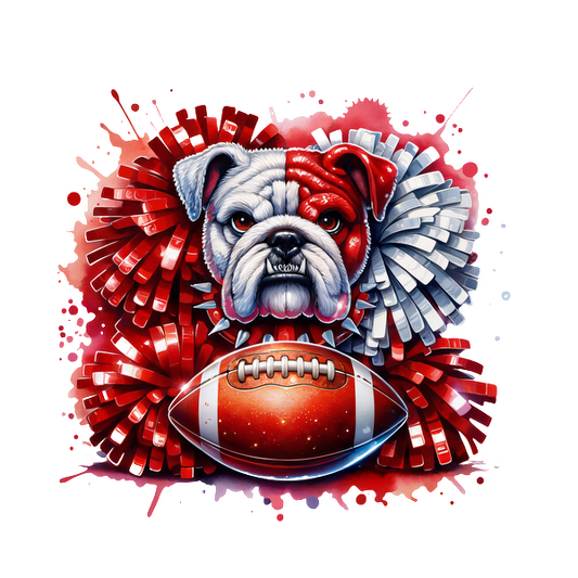 Una ilustración vibrante que presenta un bulldog entre pompones rojos y plateados, con un balón de fútbol en primer plano. Transferencias DTF