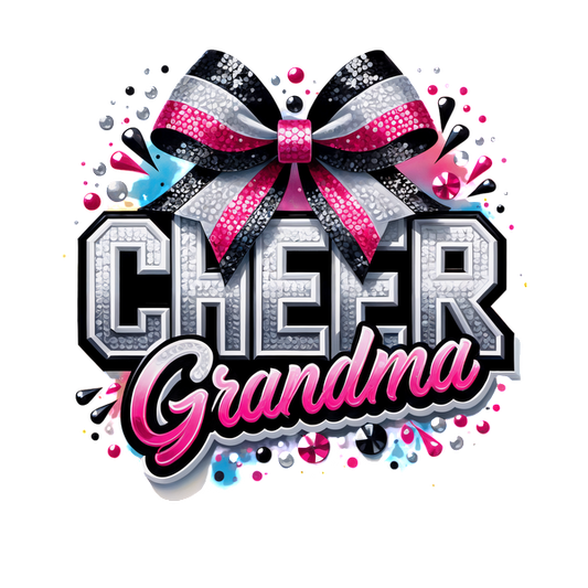 Un diseño vibrante y divertido que presenta la frase "Cheer Grandma" en letras llamativas, adornada con un lazo brillante y detalles coloridos. Transferencias DTF