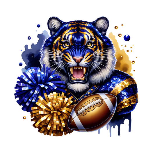 Un tigre vibrante y feroz, adornado en azul y dorado, que sostiene una pelota de fútbol con pompones y que exuda una vibra deportiva llena de energía. Transferencias DTF