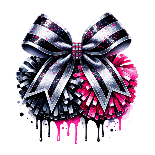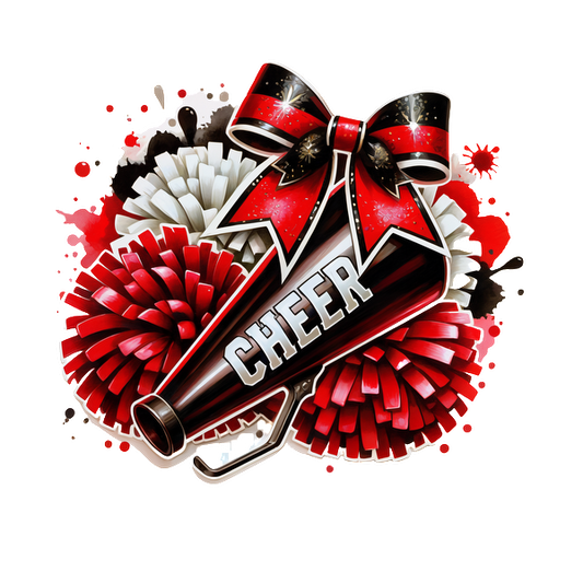 Un megáfono de porristas vibrante adornado con un lazo rojo, rodeado de pompones coloridos en rojo, blanco y negro. Transferencias DTF