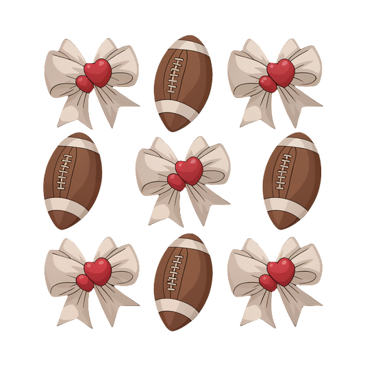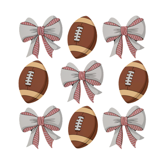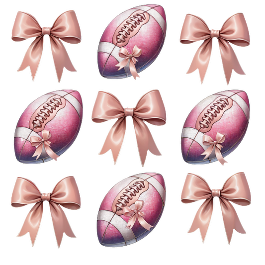 Una divertida cuadrícula de balones de fútbol rosas y lazos a juego, perfecta para darle un toque femenino a una decoración con temática deportiva. Transferencias DTF