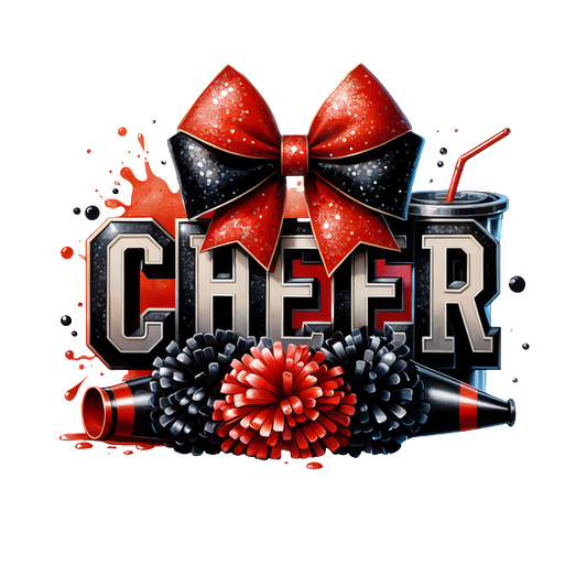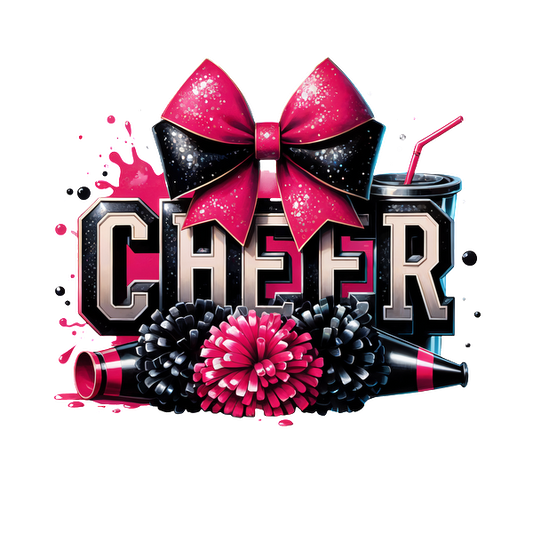 Gráfico alegre que presenta un texto llamativo "CHEER" rodeado de pompones coloridos, un lazo vibrante y una bebida. Transferencias DTF
