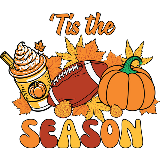 ¡Celebre la temporada con un diseño divertido que incluye una calabaza, un balón de fútbol, hojas de otoño y una bebida festiva!