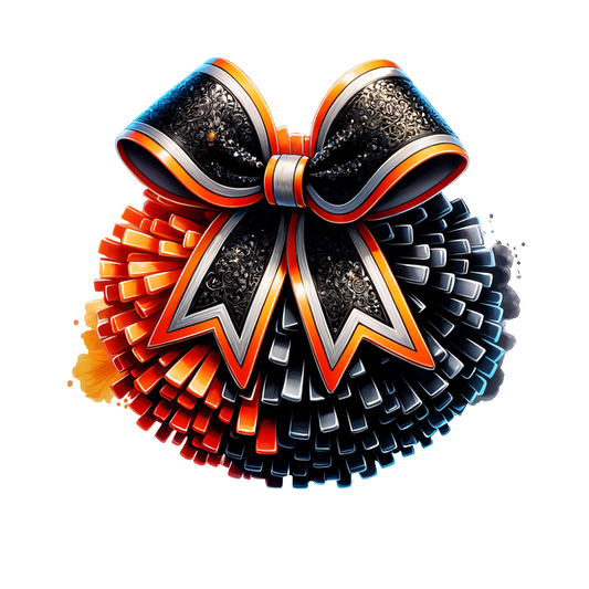 Un pompón vibrante y decorativo que presenta un lazo negro grande y adornado con detalles en naranja y plata para darle un toque festivo. Transferencias DTF