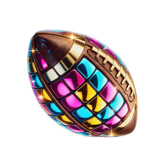 Este balón de fútbol colorido y estilizado presenta patrones de mosaico vibrantes y brillantes con detalles dorados para un diseño único y divertido.