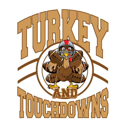 Un diseño divertido que presenta un pavo con un casco de fútbol y celebra "Turkey and Touchdowns" con letras llamativas.