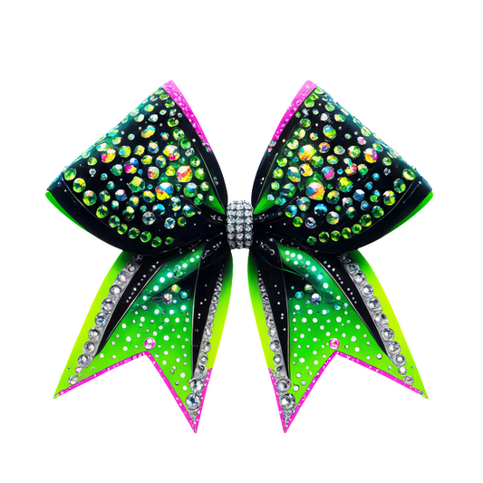 Este vibrante lazo para el cabello presenta colores negro, verde y rosa adornados con brillantes diamantes de imitación para lograr un efecto deslumbrante. Transferencias DTF