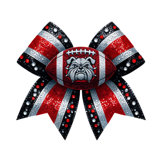Un lazo decorativo y vibrante que presenta un diseño de fútbol con un bulldog y gemas brillantes en rojo, negro y plata. Transferencias DTF