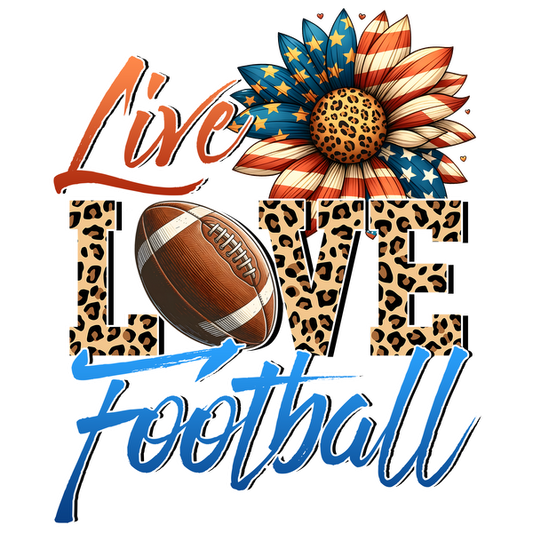 Un diseño vibrante que presenta la palabra "LOVE" rodeada de cascos de fútbol, dedos de espuma y acentos de estrellas, perfecto para los entusiastas de los deportes. Transferencias UV