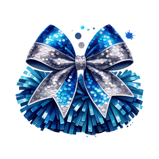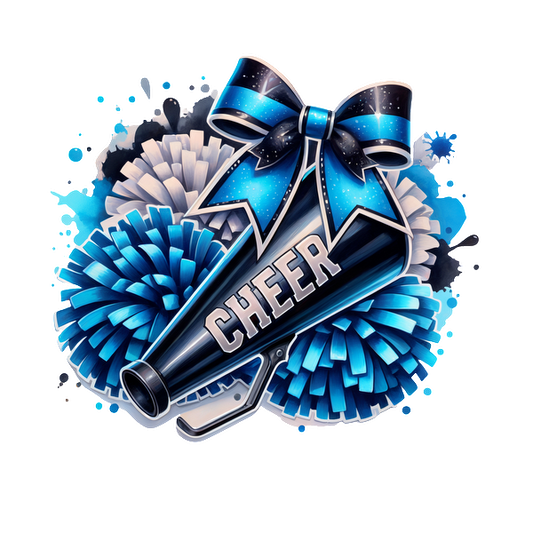 Un gráfico vibrante que presenta un megáfono de porristas adornado con un lazo azul y rodeado de pompones azules y blancos. Transferencias DTF