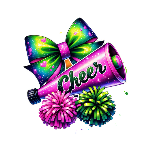 Una vibrante ilustración con temática de porristas que incluye un megáfono, pompones coloridos y un lazo brillante, ¡perfecta para el espíritu de equipo! Transferencias DTF