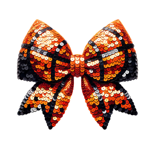 Brilla con estilo con este vibrante lazo de lentejuelas, en colores naranja, negro y blanco, ¡perfecto para cualquier ocasión festiva! Transferencias DTF