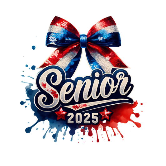 Celebre la clase de 2025 con este vibrante diseño en rojo, blanco y azul que presenta un moño festivo y un texto llamativo "Senior". Transferencias DTF