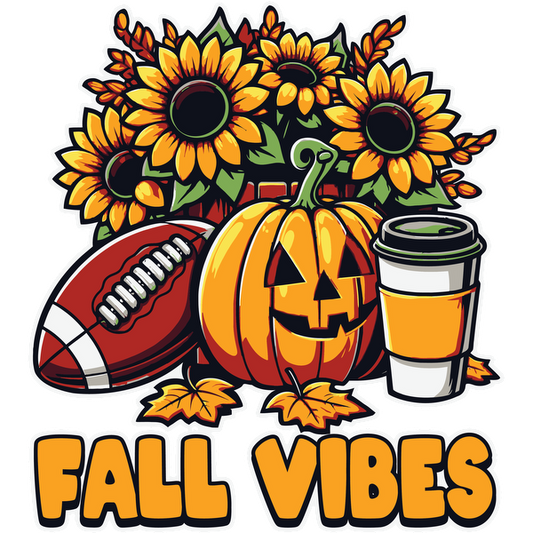 ¡Celebre el otoño con un diseño vibrante que incluye girasoles, una calabaza sonriente, una pelota de fútbol y una acogedora taza de café!