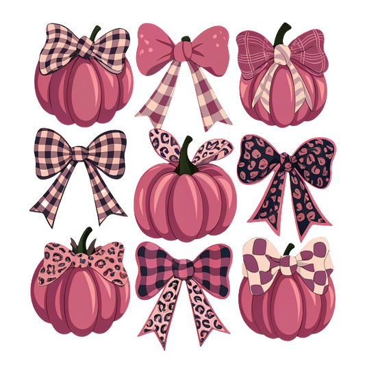Una colección vibrante de calabazas rosas adornadas con elegantes lazos en varios patrones, perfectas para la decoración festiva.