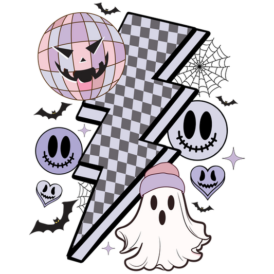 Una ilustración divertida y espeluznante que presenta un fantasma, un rayo estampado y elementos con temática de Halloween, como calabazas sonrientes y corazones.