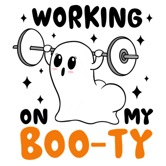 Un lindo fantasma levantando pesas con el texto divertido "Boo-ty" debajo, perfecto para un tema de fitness de Halloween.