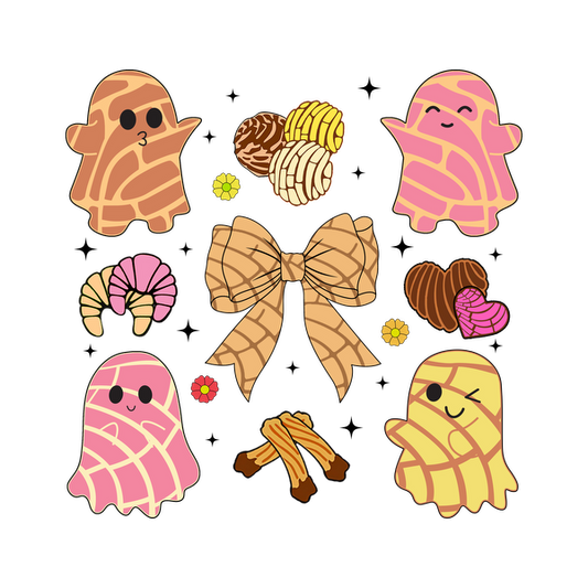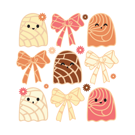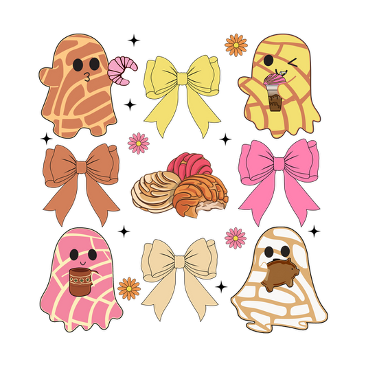 Una colección extravagante de simpáticos personajes fantasmas de colores pastel rodeados de dulces, un moño y deliciosas golosinas.