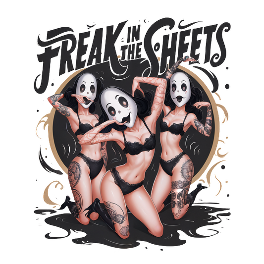 Una ilustración vibrante que presenta a tres mujeres tatuadas que visten lencería negra y divertidas máscaras de fantasmas, con el texto "Freak in the Sheets".