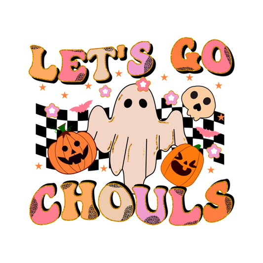 Celebre Halloween con este divertido diseño "Let's Go Chouls" que presenta un fantasma amigable, calabazas y calaveras alegres.