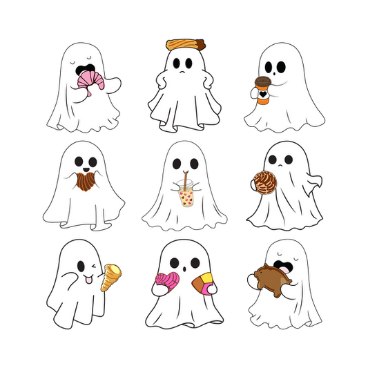Una divertida colección de simpáticos personajes fantasmas que disfrutan de diversos bocadillos y postres, incluidos helado, café y donas.