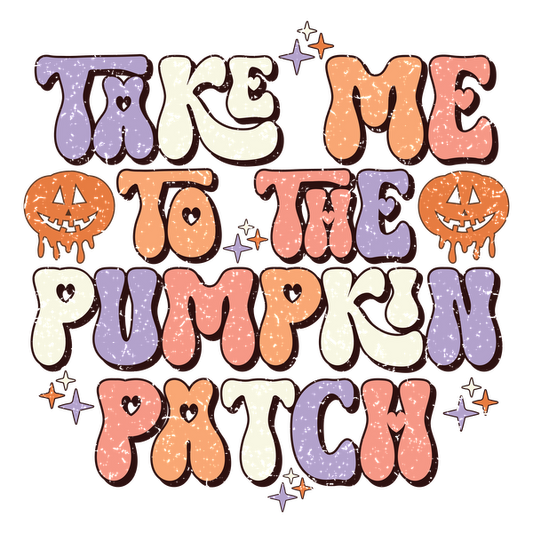 ¡Un diseño colorido y divertido que presenta la divertida frase "Llévame al huerto de calabazas", perfecto para las festividades de otoño!