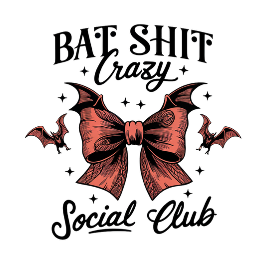 Un gráfico divertido que presenta un gran arco rodeado de murciélagos, con el divertido texto "Bat Shit Crazy Social Club".