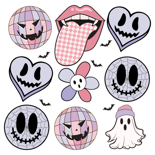 Una colorida colección de divertidas pegatinas con temática de Halloween que incluyen sonrisas fantasmales, corazones y un diseño de lengua atrevido.