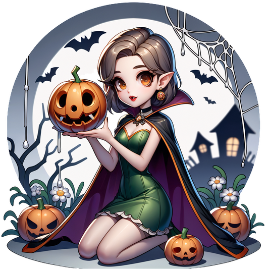 Precio habitual A partir de £0.75 GBPPrecio habitualPrecio unitario / por£2.41 GBPPrecio de oferta A partir de £0.75 GBPUna caprichosa chica vampiro con orejas puntiagudas sostiene una calabaza tallada, rodeada de decoraciones espeluznantes y un ambiente de Halloween.