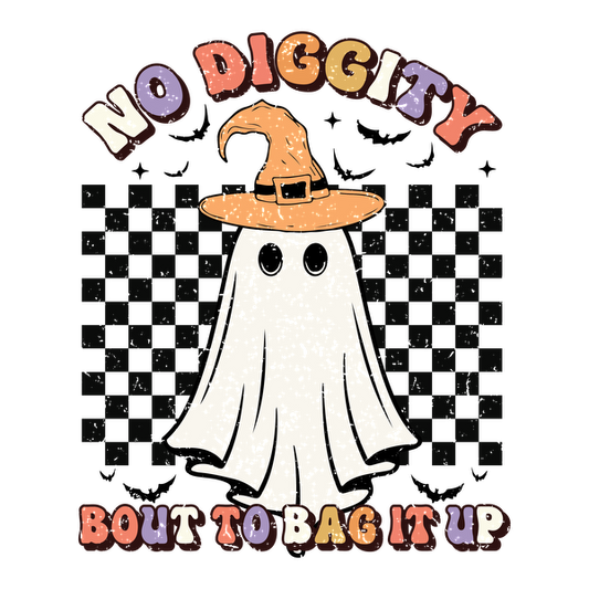 Este diseño caprichoso presenta un fantasma juguetón con un sombrero de bruja, acompañado de la divertida frase "No Diggity, Bout to Bag It Up".