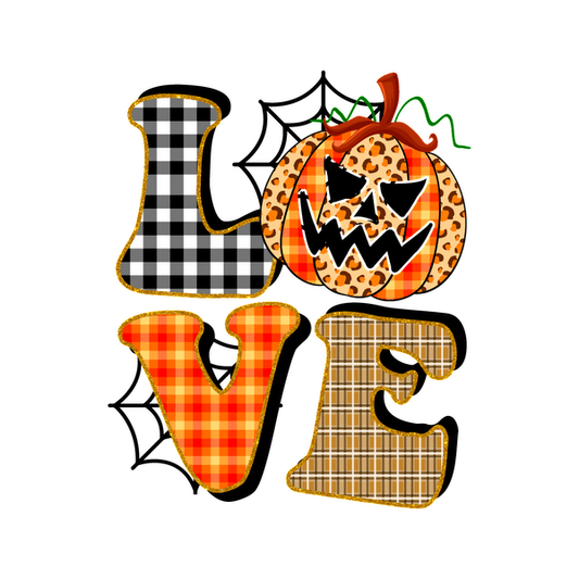 Un diseño festivo con temática de Halloween que presenta letras coloridas y divertidas que forman la palabra "AMOR" junto a una calabaza con una cara espeluznante.