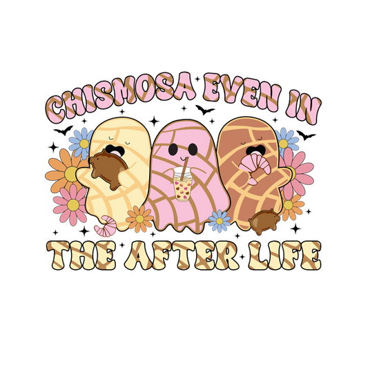 Un gráfico caprichoso que presenta tres lindos postres animados disfrutando de bocadillos, rodeados de flores de colores, con el texto "CHISMOSA INCLUSO EN EL MÁS ALLÁ".