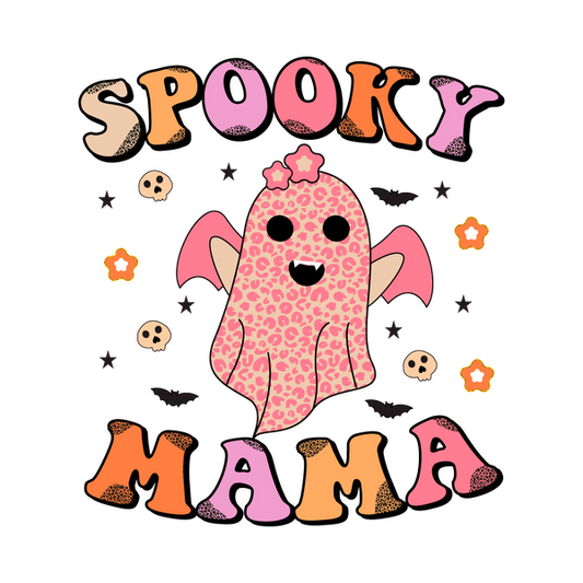 Un diseño divertido y colorido que presenta un lindo fantasma con manchas de leopardo y el texto "Spooky Mama" rodeado de estrellas y calaveras.