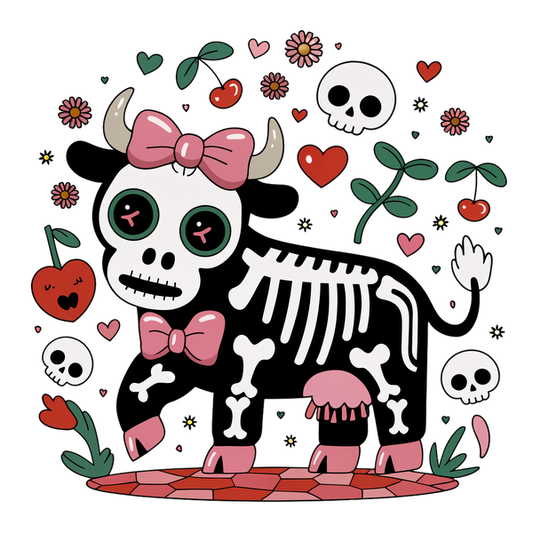 Una caprichosa vaca esqueleto adornada con un lazo rosa, rodeada de flores de colores, corazones y calaveras divertidas.
